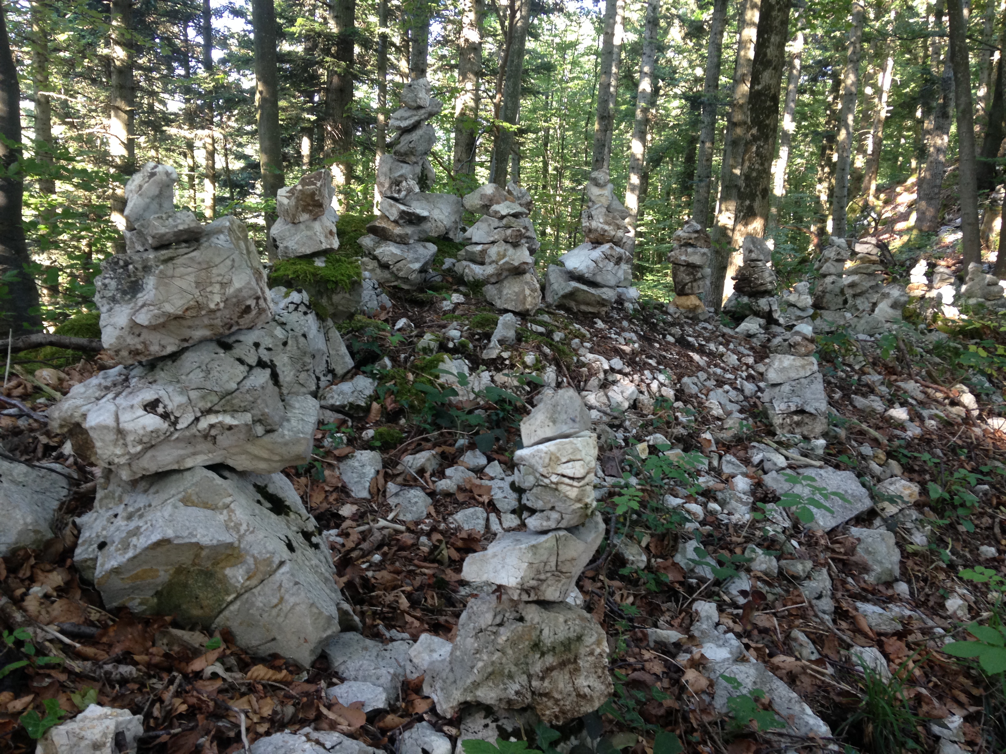 Today I took a long bike ride into France, back into Switzerland, and got lost on a mountain between one town and another. Not really lost, but I lost my path and ended up wandering down a bramble-covered stretch of what used to be a road, ended up in a sheep pasture, then a cow pasture, and then finally Movelier, the little village before Pleigne. I probably covered something like 22 miles, but it took much longer than I had intended. I suppose it was an adventure, but I can’t say I made any fantastic discoveries along the way. I did find a very strange ridge path fringed by mysterious cairns.